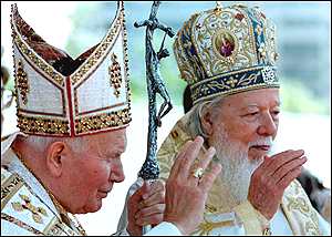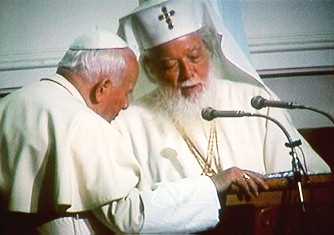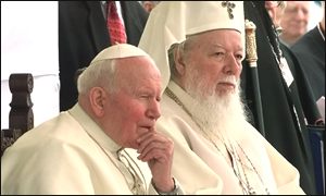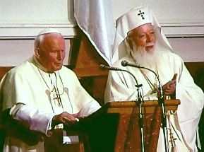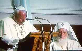 Mein ernsthafter Wunsch ist es, daß der Westen und Osten sich treffen. Es ist mir wichtig, daß jene zwei Pfeiler Meiner Kirche zusammenkommen und Meine Kirche festigen. (5. Oktober 1994) Christus a Inviat! Christos Anesti! (Der Herr ist auferstanden, ja er ist wahrhaft auferstanden!) Diese Reise nach Rumänien, die auf so unerwartete und schicksalhafte Weise organisiert zustande kam, war zeichenhaft dafür, daß der Herr zu diesem historischen Besuch von Papst Johannes Paul II. bei seinem Bruder im Osten, Seiner Ehrwürden Patriarch Teoktist, dem Patriarchen der Rumänisch Orthodoxen Kirche, Vassula dabei haben wollte. Ich begleitete Vassula. Wir waren beide unter den offiziellen Gästen Patriarch Teoktists, und so wurde uns auf großartige Weise der private Zutritt zu außergewöhnlichen Ereignissen möglich gemacht. Am Mittwoch, dem 5. Mai 1999 machten wir uns von Genf aus nach Bukarest auf den Weg. Viele Tage lang hatten die Temperaturen bei 27 Grad C gelegen und so waren wir ziemlich überrascht, daß der Pilot bei unserer Landung eine Bodentem-peratur von 7° C ankündigte. Strömender Regen empfing uns und ein eiskalter Wind blies uns entgegen. Es schien, als sei die Natur aus den Fugen und harre eines froheren Ereignisses. Und wirklich, am Freitag dem 7. Mai, dem Tag, an dem der Hl. Vater ankommen sollte, war der Himmel klar und blieb so bis zu seiner Abreise. An diesem selben Tag um halb zwei stand auf dem Programm, daß der Hl. Vater und Patriarch Teoktist im Patriarchat im Zentrum Bukarests zusammentreffen würden. Das Gebäude steht auf einem Hügel und überblickt einen schönen kleinen Platz, der auch von der Kathedrale und der Wohnung des Patriarchen gesäumt wird. Weil wir Pässe hatten, konnten wir nach einer ausführlichen polizeilichen Kontrolle ungehindert passieren. Der Hl. Vater und der Patriarch, beide in Weiß, kamen im Papstmobile an. Glocken läuteten und man begrüßte sie enthusiastisch unter Singen von Byzantinischen Liedern. Es fing in der Kathedrale an mit einem Gebet, dann überquerten sie den Platz und gingen schließlich die paar Stufen hinauf zur Vorhalle des Patriarchats, von wo sie ihre entsprechenden Reden hielten. Wir standen am Fuße dieser Stufen, drei Meter vom Papst und dem Patriarchen entfernt, genau gegenüber von den sie begleitenden Bischöfen, Kardinälen und Metropoliten. Wir standen so nahe beim Hl. Vater, daß sein Blick einmal, als er in die Richtung der Menge schaute, auf uns fiel und mit einem Nicken lächelte er Vassula zu als ob er sie grüßen wolle. Vassula wußte innerlich, daß er sie erkannt hatte. Nach ihren Ansprachen gingen der Papst und der Patriarch ins Patriarchat hinein und kamen nach ein paar Minuten wieder heraus. Ihnen folgte der Metropolit Daniel, die rechte Hand des Patriarchen. Er grüßte Vassula herzlich von den Stufen herunter. Ihn begleiteten Vater Bria, der frühere Direktor der Abteilung Einheit und Erneuerung beim Weltkirchenrat in Genf, der unsere Reise arrangiert hatte. Vassula war mit dem Metropoliten Daniel und dem Patriarchen Teoktist im Mai 1994 in Iasi, Rumänien bei einer Beratung zusammengetroffen, die vom Weltkirchenrat über das Thema Christliche Spiritualität für unsere Zeit ausgerichtet worden war. Vassula war auch damals extra dazu eingeladen worden und wurde von P. OCarroll begleitet. Vassulas Einladung diente der Darlegung der Botschaft und der Forderung des Herrn nach Einheit und der Zusammenlegung der Ostertermine. Diese Forderung wurde in Erwägung gezogen und schließlich war es einer von den fünf endgültigen Empfehlungspunkten der Beratung, daß eine neue Initiative ergriffen werden solle zur gemeinsamen Feier des Osterfestes. Dem folgte dann im März 1997 die Beratung in Aleppo, in Syrien, welche die Kirchen einlud, Einverständnis anzustreben über ein gemeinsames Datum zur Feier des Osterfestes. Die Idee wurde wiederum im Oktober 1998 in Washington von der Nord-Amerikanischen Orthodox-Katholischen Theologischen Beratung aufgegriffen. Ihre Empfehlung war, daß man dem Prinzip folgen solle, wie es vom Konzil in Nizäa festgelegt worden war. Es ist interessant festzustellen, daß sogar die Lutherische Kirche auf denselben Linien arbeitet. Ishmael Noko, der Generalsekretär des Lutherischen Weltbunds bat 1997 seine 124 Mitgliedkirchen, den Ratschlag der Aleppo-Konsultation zu einem gemeinsamen Osterdatum zu studieren. Bei einem Interview in Genf betonte Reverend Noko die Wichtigkeit dieser Übereinkunft: "Was auf dem Spiel steht, ist mehr als die Frage eines gemeinsamen Osterdatums, es ist die Frage nach der Einheit der Kirche ein Ereignis betreffend, das die Kirche als den Leib Christi definiert. Der Leib Christi ist geteilt wegen mathematischer Kalkulationen, doch die Auferstehung der Toten gibt uns mehr Kraft, uns über menschliche Begrenztheiten zu erheben. Ein gemeinsames Datum für die Feier von Ostern würde ein sichtbares Zeichen der Einheit sein". Was Vassula angeht, - ich bin versucht, sie den Johannes den Täufer unserer Zeit zu nennen, - sie zeigt der Welt durch das ihr gegebene Charisma den Weg zur Einheit. Wir hatten zwei Dossiers vorbereitet, eines für den Papst und das andere für den Patriarchen. Sie enthielten einige ausgewählte, wichtige Botschaften aus dem Wahren Leben in Gott über das gemeinsame Datum für Ostern und über die Versöhnung zwischen der Östlichen und der Westlichen Kirche. Hervorgehoben wurden besonders gewisse Stellen, damit sie sich über die Beständigkeit und Eindringlichkeit klar würden, mit welcher der Herr danach ruft, die Osterdaten zu vereinen. (Siehe am Ende dieses Berichts eine Aufzählung einiger dieser Botschaften) Auch war sowohl eine Aufzählung von Meetings enthalten, die Vassula über die ganze Welt hin von 1988 bis 1999 gehalten hat (ungefähr 580 Meetings) als auch eine Bibliographie darüber, in welchen Sprachen Das Wahre Leben in Gott erhältlich ist. Wir fragten uns, ob es Vassula gelingen würde, ihnen die Dossiers zu ge