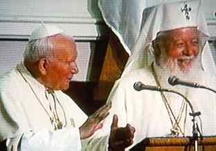 In einem großen Raum mit vielen kleinen Buffet-Tischchen waren dann zwei Lehnstühle und ein kleiner Tisch für zwei Personen für den Hl. Vater und den Patriarchen hergerichtet. Die warme und behagliche Atmosphäre dieses Treffens war sicher unerwartet für den Hl. Vater und seine Begleitung. Wir hatten ursprünglich geplant, das Dossier dem Papst sogleich zu überreichen, wenn er in den Raum kommen würde, doch nach dem Singen des Vaterunsers in Rumänisch und dem Segen stürmten ein paar Leute nach vorne und umringten den Hl. Vater, wobei sie eine Barriere vor Vassula bildeten. Dieses Verhalten veranlaßte den Hl. Vater und den Patriarchen, den Raum zu verlassen. Es stellten sich uns jedesmal, wenn wir dem Ziel uns nahe fühlten, Hindernisse in den Weg. Vassula, eine Orthodoxe unter Orthodoxen, unterstützt von ihrer Kirche, wurde somit Zeuge dieses Meetings und sie sah mit ihren eigenen Augen gewisse ihr vom Herrn gemachte Vorhersagen in den Botschaften das Wahre Leben in Gott buchstäblich in Erfüllung gehen. Glanz und Pracht wird vom östlichen Ufer scheinen. Deshalb sage Ich zu dem Haus im Westen: Schaut nach Osten! Weint nicht so bitterlich über den Glaubensabfall und die Zerstörung eures Hauses. Werdet nicht von panischem Schrecken erfaßt, denn morgen werdet ihr zusammen mit Meinem Sproß des östlichen Ufers essen und trinken. (24.Oktober 1994) Meine Krone der Herrlichkeit wird Mir vom Osten dargebracht werden..... Ich werde Meinen Nachkommen vom östlichen Haus erheben, damit er die Einheit voranbringt und am Ende alle Nationen unter Einem Namen zusammenkommen. (7. Dezember 1994) In Meiner Barmherzigkeit und um Meiner Liebe willen werde Ich aus dem Osten wenigstens einen einzigen erheben, der zu seinem Bruder (dem westlichen Bruder) sagt: Komm und betrete meinen Grund. Komm und iß von meinem Tisch, komm und trink mit mir! Meine Fässer sind zum Überlaufen voll von neuem Wein. Laßt uns unsere Lämmer zusammen weiden und einen Garten Eden aus unseren Weiden machen. (24. 10. 1994) Vom Osten her werde ich ein großmütiges Herz zur Eile anfachen, das in seiner Loyalität einen Friedensvertrag mit dem Westen besiegeln wird. (5.10.1994) Nachdem sich Papst und Patriarch zurückgezogen hatten, trafen wir den Rumänischen Botschafter beim Heiligen Stuhl, den Vassula schon in Rom getroffen hatte, und Vater Galeriu, einen sehr frommen Orthodoxen Priester, der Das Wahre Leben in Gott in Rumänien fördert. Am Sonntag Morgen, 9. Mai 1999, machten wir uns auf den Weg zu einem sehr großen Platz, der mit viel Grün umgeben ist, und wir nahmen dort an der Orthodoxen Göttlichen Liturgie teil, welcher Patriarch Teoktist in Anwesenheit des Hl. Vaters vorstand, und auch eine riesige Volksmenge war anwesend. Wir waren eine Stunde vorher da, um uns gute Plätze zu sichern. Bei dieser Gelegenheit trafen wir einen der Berater des Patriarchen, Vater Basil. Er wurde begleitet von Vater Bria und seiner Frau. Alle drei kamen und setzten sich neben uns. Vater Basil hat früher in Lausanne gelebt und die Konversation mit uns schien ihm zu gefallen. Also ich ihm von Vassulas Charisma erzählte, schien er sehr offen dafür und interessiert. Ich gab ihm eine Broschüre über die Gaben des Heiligen Geistes, die ich gerade dabei hatte und wir boten ihm nach der Feier noch andere Bücher an. Da wir nur ein paar Yards entfernt standen, war es leicht und wir konnten lange mit ihm reden. Weil wir kein Rumänisch verstanden, paßte er während der Liturgie gut auf, um durch seine Kommentare zum besseren Verständnis für uns beizutragen. Bei der Kommunion sahen wir eine kleine Anzahl von Menschen nach vorne treten, um die Hostie zu empfangen, meist Kinder. Nur der Patriarch teilte aus. Dann, am Nachmittag, zelebrierte der Hl. Vater auf einem weiten Platz vor dem früheren Palais von Ceaucescu eine Hl. Messe vor einer sehr warmherzigen und begeisterten Menge aus ganz Rumänien, die auf eine Million geschätzt wurde. Der Patriarch nahm daran teil zusammen mit Orthodoxen und Griechisch-Katholischen Priestern. Die Lieder und Gebete stiegen zum Himmel auf mit einer eindrucksvoll natürlichen Kraft. In einer perfekt durchorganisierten Weise schwärmten ungefähr hundert Priester aus unter die Menge, um denen die Hl. Kommunion zu bringen, welche sie empfangen wollten. All dies fand statt in einer Atmosphäre von glühendem Gebet und tiefer Frömmigkeit. Als die Messe vorbei war, begann die Menge lebhaft zu rufen: UNITATE! UNITATE! (Vereint euch!) Hocherfreut rief der Hl. Vater zum Schluß aus: Dann laßt uns schnell machen! Der dreitägige Besuch des Papstes fand in einer Atmosphäre statt, die in besonderer Weise freundlich, locker und festlich war und ohne zu viel Protokoll. Der Patriarch hat große Aufmerksamkeit auch auf das kleinste Detail verwendet, und es war eine große Freude im gegenseitig behutsamen Umgehen miteinander zu spüren. Was die zwei Dossiers angeht, so waren wir schließlich in der Lage, sie in gute Hände zu geben. Heute bin ich zutiefst gerührt von jedem Zartgefühl seitens meiner Geschöpfe, wenn sie versuchen, Mein schwankendes Haus wiederherzustellen. Bei jedem Schritt zur Einheit freut sich der ganze Himmel. Jedes Gebet, das für die Wiederherstellung Meines Leibes dargebracht wird, vermindert den Zorn Meines Vaters. Bei jeder Versammlung für die Einheit in Meinem Namen werden Meine Segnungen über diejenigen ausgeschüttet, die an diesen Treffen teilnehmen. Meine Augen wachen über die, die Mich lieben und die trotz ihrer Unvollkommenheiten Meine brennenden Wünsche erfüllen. (5. Okt. 1994) Und schließlich aus der Botschaft vom 24. Dez. 1989, Heilig Abend: (Fall der kommunistischen Diktatur in Rumänien) Meine Blume, Ich bin das Licht der Welt. Singe und sei glücklich, singe aus lauter Freude, weil Ich es bin, Jesus, der diese Wunder vollbringt. Mein Kreuz wird bald wieder auf jeder Kirche aufgerichtet sein siehst du es? Bald wird ein universaler Friede einkehren. Der Friede ist d
