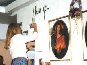 Vassula aufgenommen währenddem sie die Botschaft von Jesus auf die Wand schreibt.