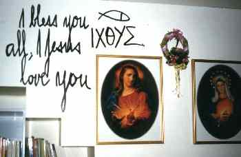 Auge. Vassula erklärte später, dass Jesus ihre Hand führte, um Seinen Namen an der Wand zu hinterlassen, weil die Gebetsgruppe die Frucht