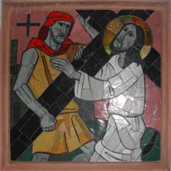 Sie banden Meine Füsse mit Stricken zusammen und befahlen Mir, bis zu der Stelle zu gehen, wo sich Mein Kreuz befand. Tochter, Ich konnte nicht gehen, da sie Meine Füsse gefesselt hatten. Da haben sie Mich zu Boden gezerrt und Mich an den Haaren bis zu Meinem Kreuz geschleppt. Mein Schmerz war unerträglich; von der Geisselung herabhängende Teile Meines Fleisches wurden weggerissen. Sie lösten die Fesseln Meiner Füsse und gaben Mir Fusstritte, damit Ich aufstehe und Meine Last auf Meine Schultern hebe. Ich konnte nicht sehen, wo Mein Kreuz war, denn die Dornen, die in Meinen Kopf eingedrungen waren, füllten Meine Augen mit Meinem Blut, das über Mein Gesicht floss. Da haben sie Mein Kreuz aufgehoben und legten es Mir auf die Schultern und stiessen Mich zu dem Tor hin. Ach Tochter, wie schwer war Mein Kreuz, das Ich tragen mußte! Im Finstern tappend bin Ich Richtung Tor gegangen, getrieben von der Peitsche hinter Mir. Ich versuchte, Meinen Weg zu sehen durch Mein Blut hindurch, das Mir in den Augen brannte. (9. November 1986)Das Kreuz, das du tragen wirst, ist Mein Kreuz des Friedens und der Liebe. Um jedoch Mein kostbares Kreuz zu tragen, Tochter, musst du zu grosser Selbstaufopferung bereit sein. Sei stark und trage Mein Kreuz mit Liebe; du wirst es mit Mir tragen, und du wirst Meine Leiden teilen.
